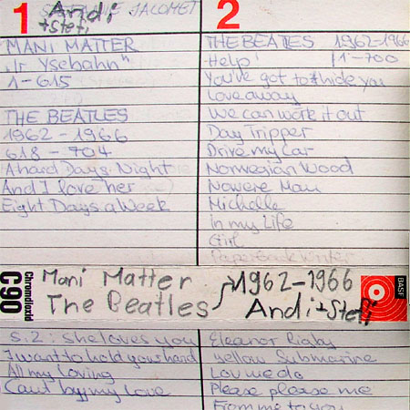 Mein erster Zugang zu guter Musik war aber ein Tape von Stefi, meiner Mutter, die irgendwann in den 70ern das Beatles-Songs auf ein BASF-Tape kopiert hatte – zuammen mit “Ir Ysebahn” von Mani Matter. Nach der Chue am Waldrand kam also “A Hard Days Night”… und die Bezeichnung, dass das Tape Stefi gehört, hab ich frech etwas nachkorrigiert: