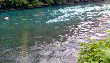 … plätschert man gemütlicher denn je ins schönste aller Berner Flussbäder (mal abgesehen von den naturbelassenen Orten wie der himmlischen Bremgarten-Tunnelschlaufe oder einigen nicht so menschenüberfluteten Elfenauplätzlis): Dem Lorrainebad, wo man – während des Wartens auf den Ruf “(Mikrofonknack…) Zwöihunderteinefüfzg, zwömau Fischchnuschperli” zwischen allerlei gross-gemächlichen und klein-nervösen Fischen noch eine Runde im Quellwasser drehen kann. Und das bei echten lorrainophilen so beliebte Kitzeln der Wasserpflanzen an den Füssen spüren.