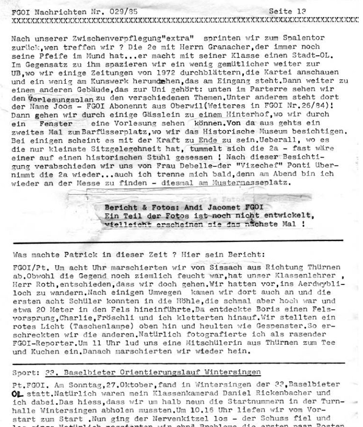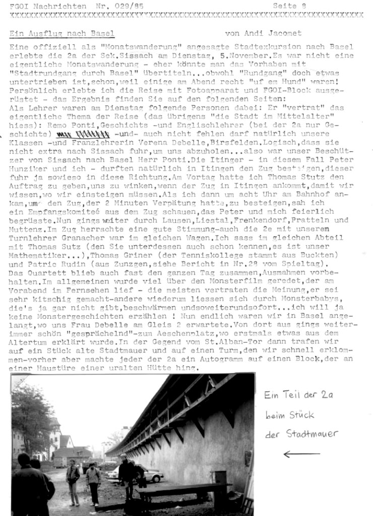 Heute vor 40 Jahren machte unsere Oberbaselbieter Sek-Klasse einen Ausflug nach Basel. Das war im Jahre 1985, mit etwa 13, so etwas wie der Ausflug “in die grosse weite Welt hinaus”. Natürlich war der Schülerzeitungsreporter live dabei und verewigte die Abenteuer der Landeier in der Grossstadt.