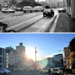 Und noch zwei Vergleichsbilder (einmal jeweils beide in Schwarzweiss), die tatsächlich am genau gleichen Tag im Abstand von 40 Jahren aufgenommen wurden – Aeschenplatz und Theater: