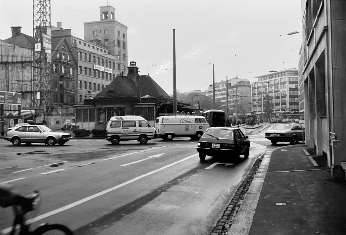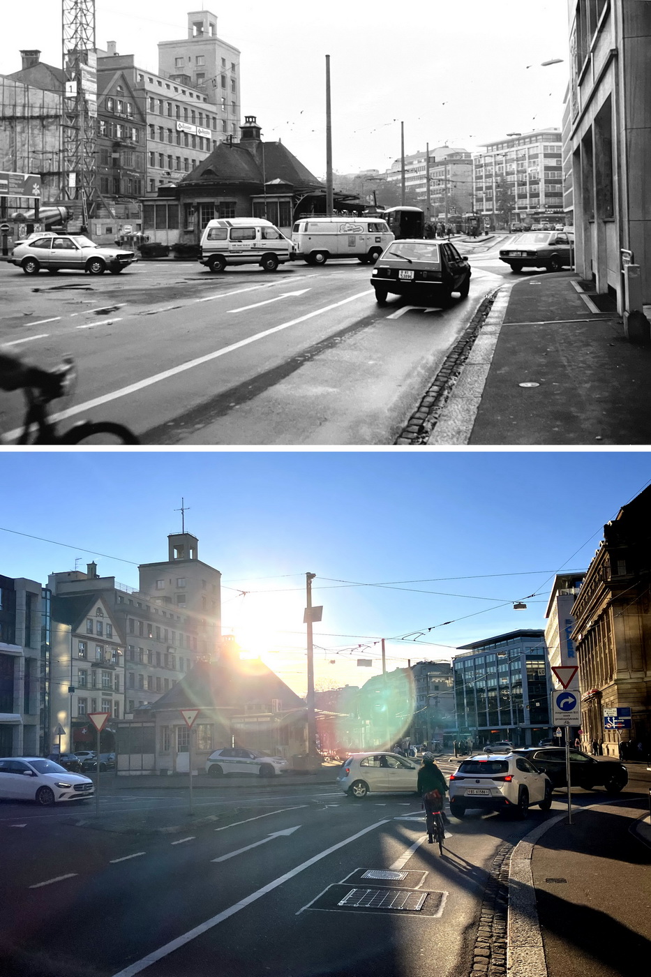 Und noch zwei Vergleichsbilder (einmal jeweils beide in Schwarzweiss), die tatsächlich am genau gleichen Tag im Abstand von 40 Jahren aufgenommen wurden – Aeschenplatz und Theater: