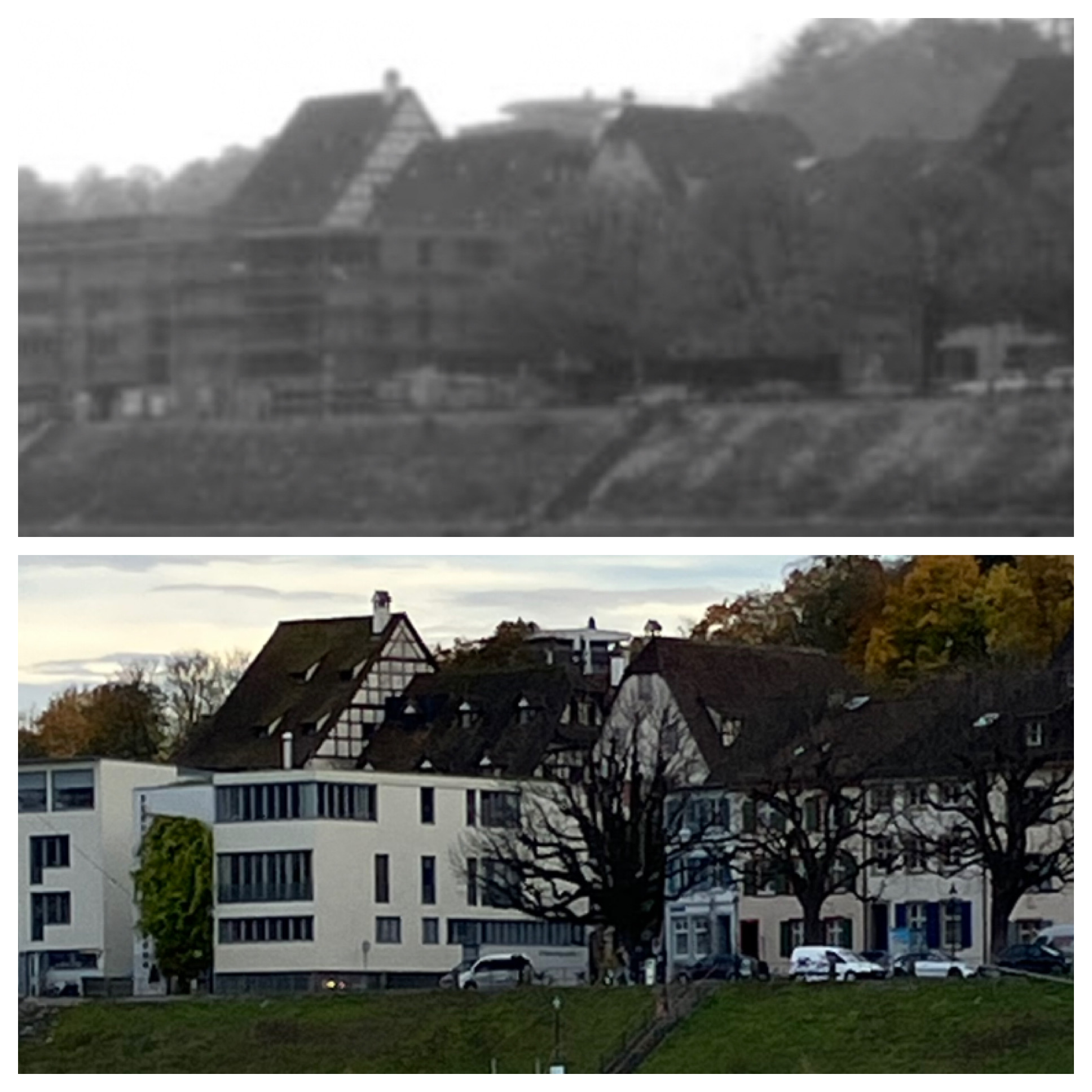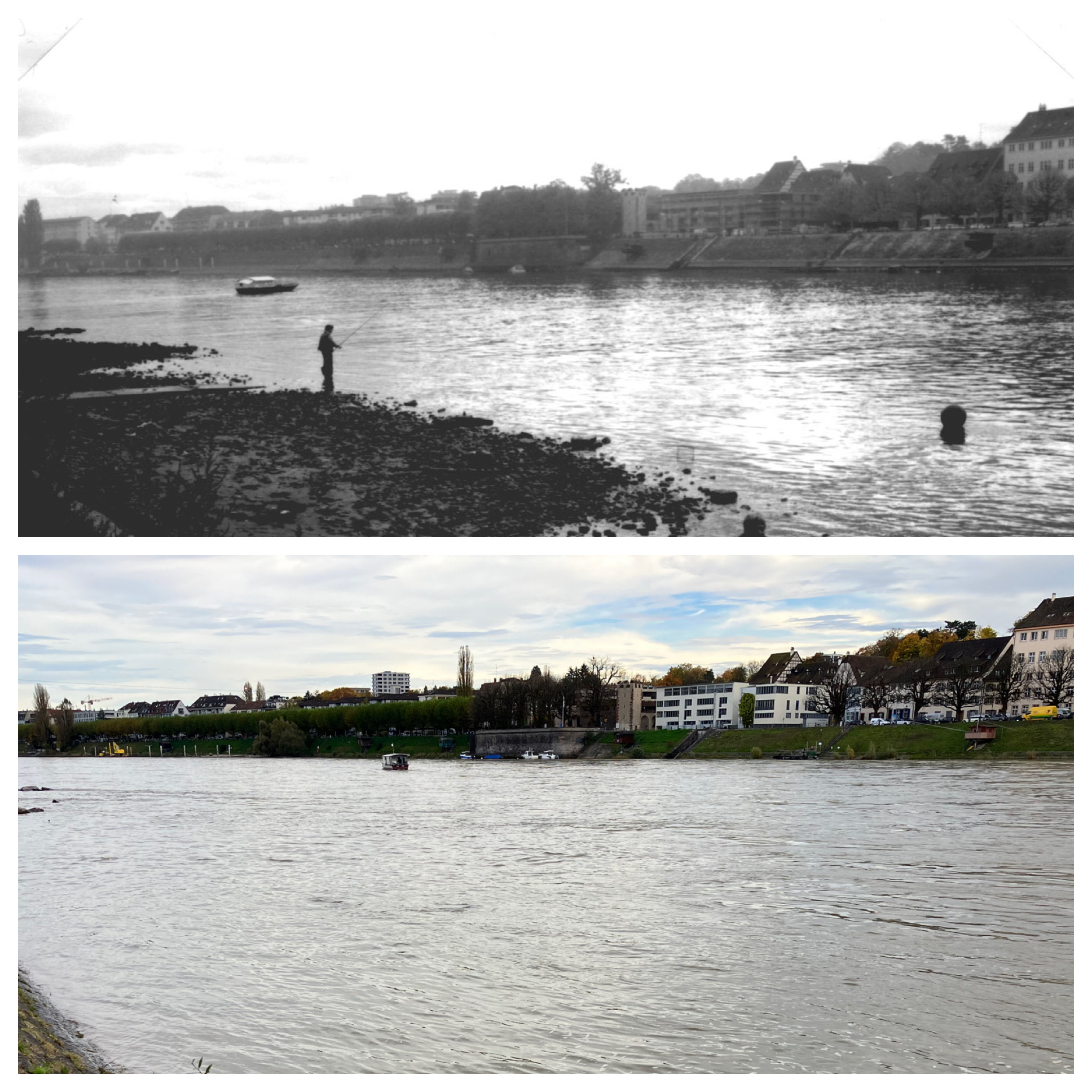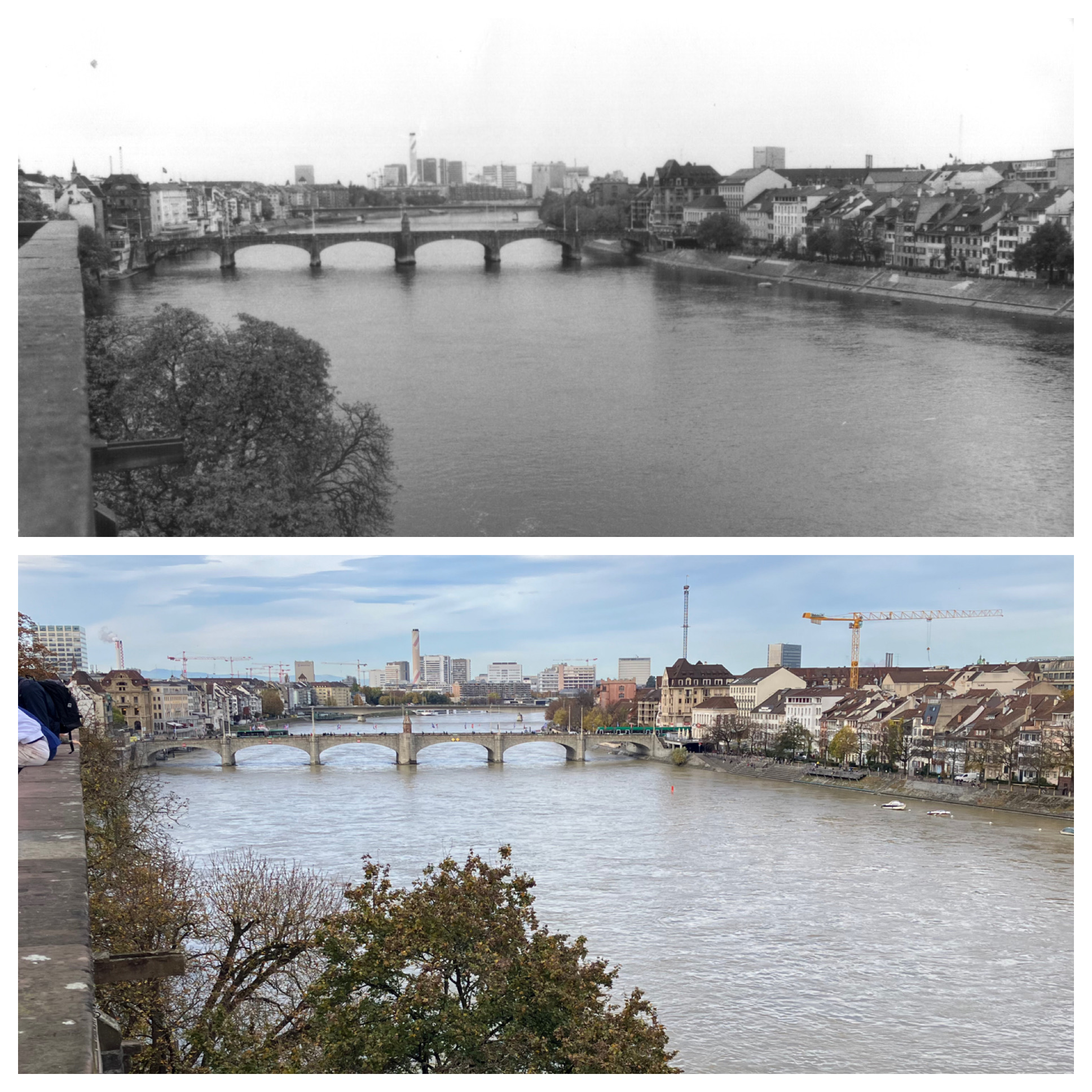 Vergleichsbilder aus der gleichen Woche 2025 und 1985 vom Rhein, “uf dr Pfalz” und vom Spalenberg: